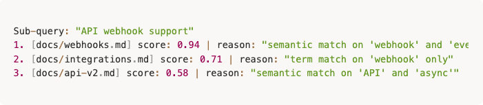 Specifically: visibility into what query variations were tried, which documents or knowledge nodes were ranked highest, why they were ranked that way, and what confidence the retrieval system assigned to each choice.